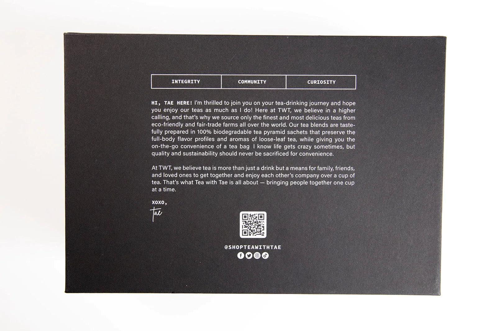 Tea with Tae is a woman-owned tea company offering premium teas sourced from some of the most exquisite and finest tea farms in the world. Our tea is served in eco-friendly tea sachets to preserve the sophisticated flavor profiles and aromas of each tea, while maintaining the convenience of a tea bag. It's the best of both worlds, especially for those who are constantly on the move and hustling everyday!