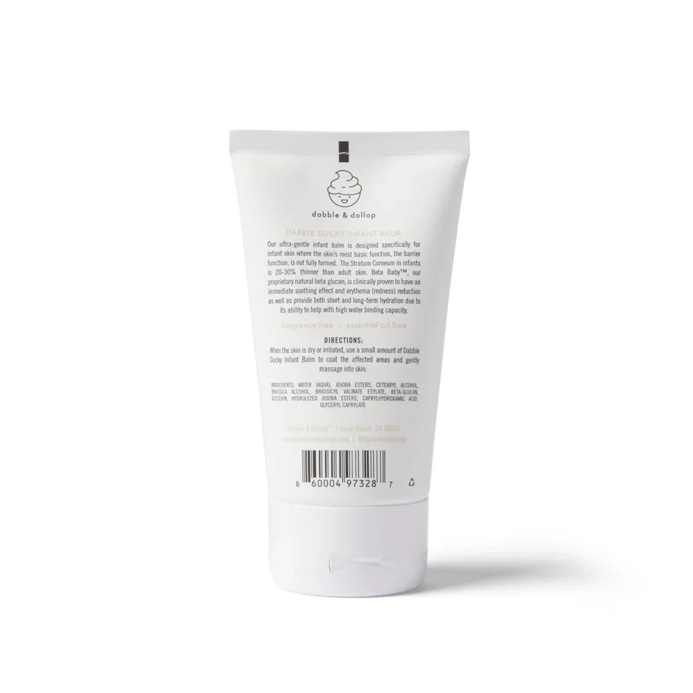 Dabble Ducky Infant Balm is an unscented, dye-free, pH-balanced balm designed for delicate infant skin, eczema prone skin, and sensitive/dry skin of all ages.