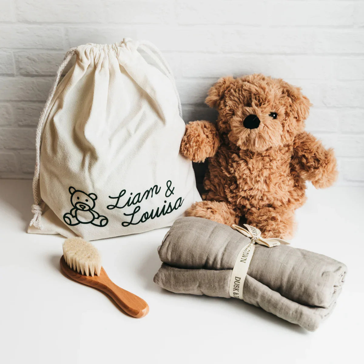 • Liam & Louisa™ Drawstring Bag – classic cotton keepsake bag for easy storage or travel