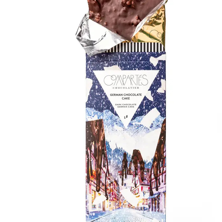 Compartes Brand NEW German Chocolate Cake Bar, made with chunks of homemade german chocolate cake, tons of pecans and coconut and German chocolate cake frosting. With a beautiful chocolate covered village scene, this gorgeous packaging and super popular dessert inspired flavor promise a best selling chocolate bar! A decadent dark chocolate delight that is sure to be a hit!.