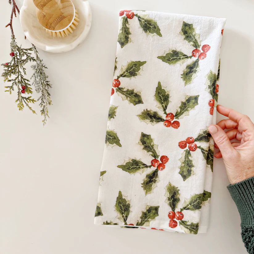 Add a touch of Christmas cheer to your kitchen with this 100% cotton tea towel. Festive holly illustrations cover the towel, making it perfect for gifting, washing up, wrapping up treats, or displaying in your kitchen for a splash of color.