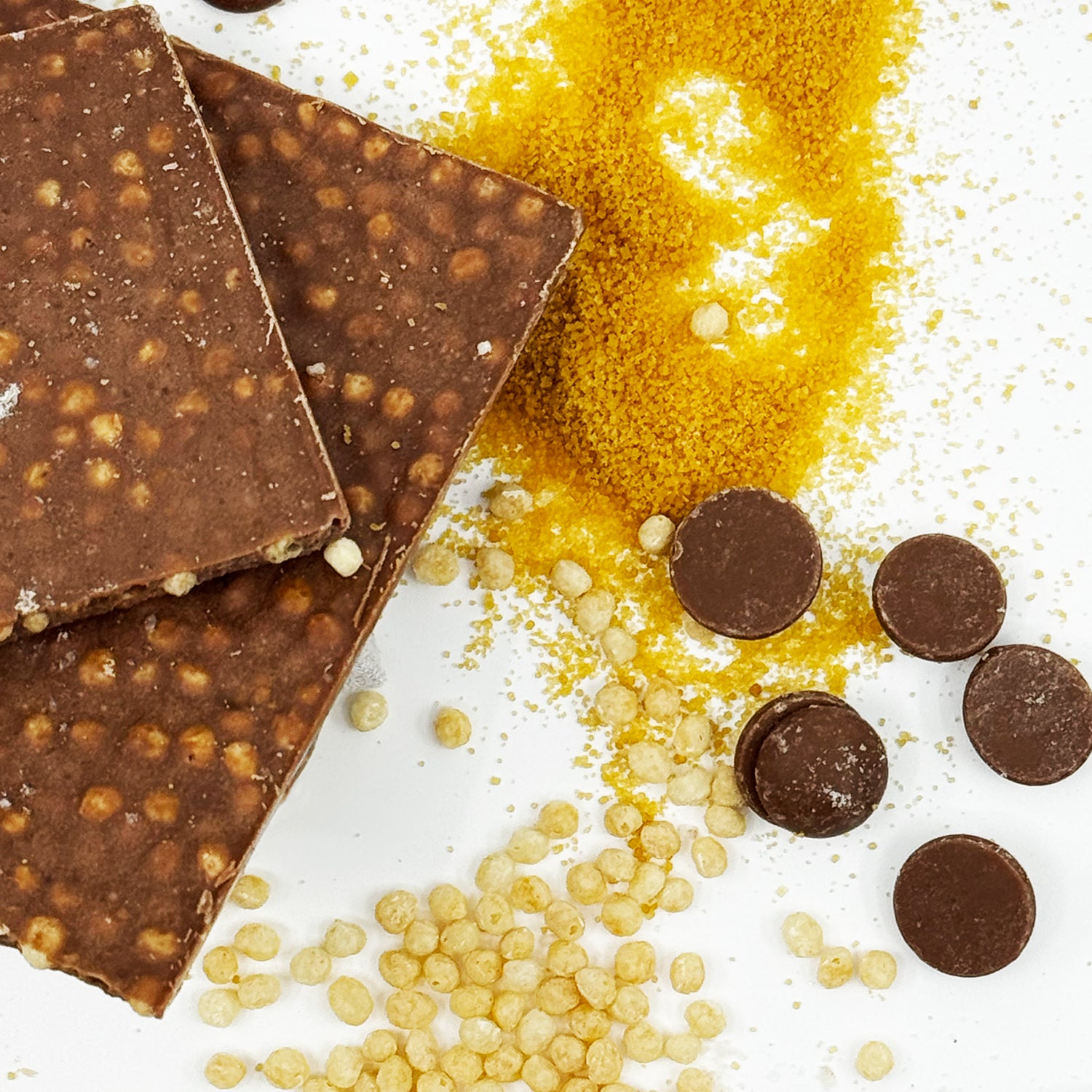 Creamy milk chocolate with a satisfying crunch from puffed rice pearls, toasted maple sugar, and a touch of smoked sea salt. A Nordic-inspired twist with a satisfying snap.