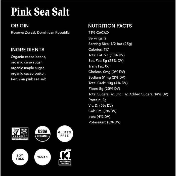 A fruity, complex salted dark chocolate to end all salted dark chocolates. Made with single origin cacao from Zorzal Cacao, a farm and fermentary within a bird sanctuary in the Dominican Republic, and sprinkled with Peruvian pink salt sourced from Salt of the Earth Co. We think New York Magazine said it best: this bar has a “deep, dark, mysterious flavor with hints of cherry; and a finish as long as a David Foster Wallace footnote.”