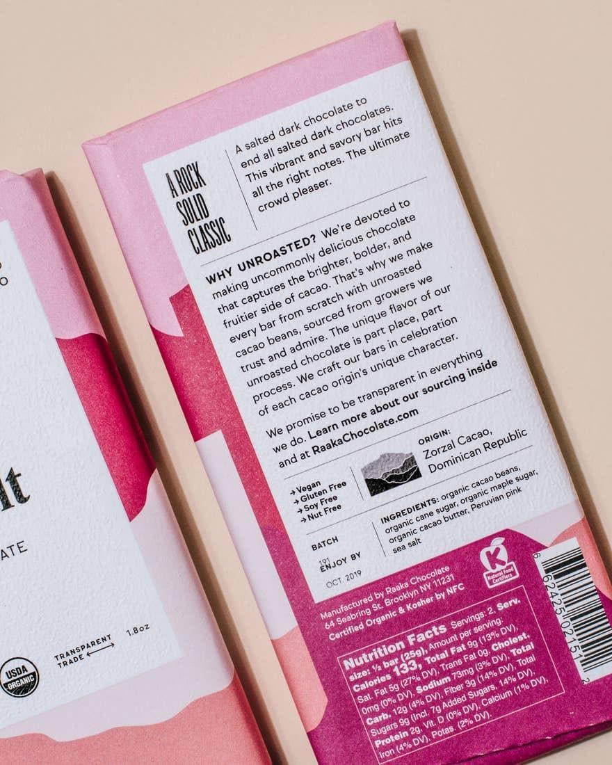 All of Raaka's chocolate is certified organic, certified kosher, vegan, soy free, gluten free, and Non-GMO and made with ethically sourced, transparently traded unroasted cacao.