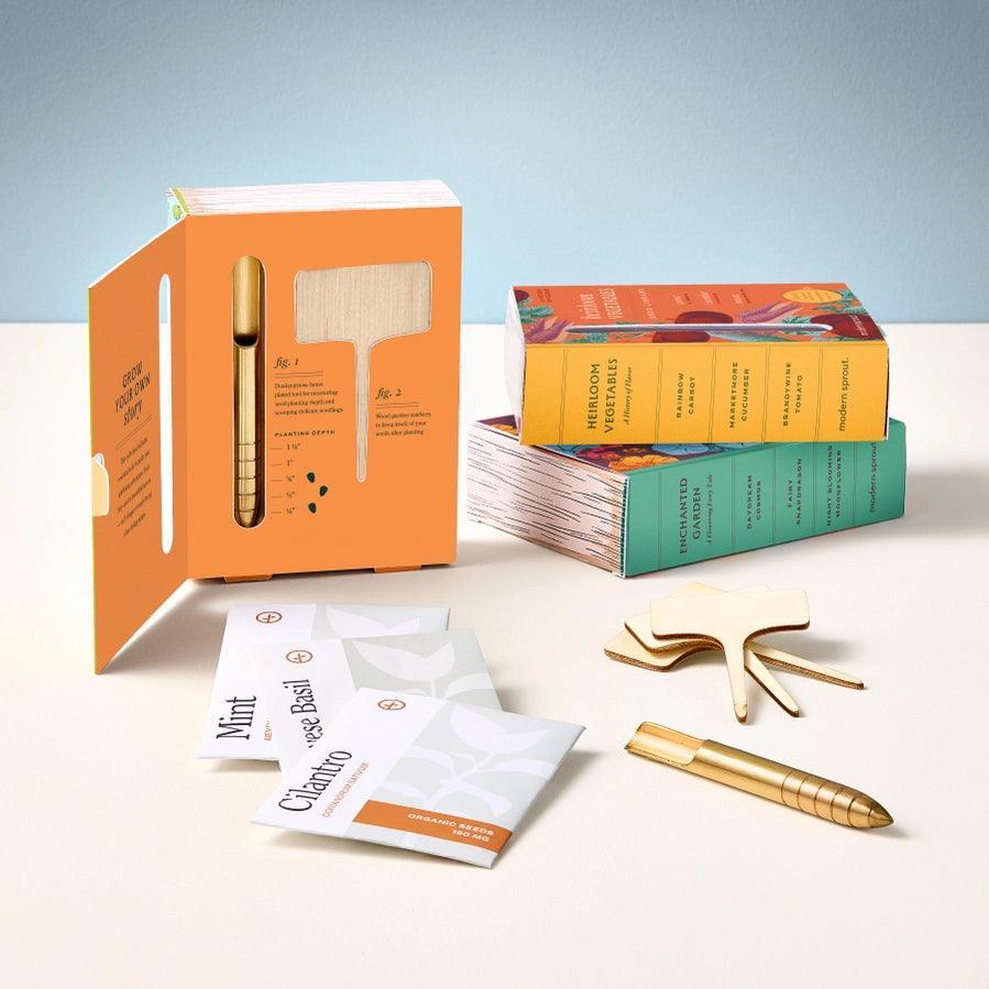 Sets contain three thoughtfully sourced seed packets, three bamboo garden markers, and a dual-use brass dibber tool.